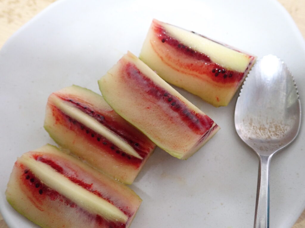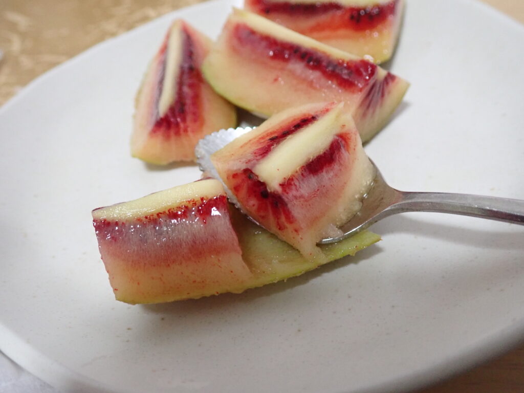 さて食べてみた感想としては赤い部分やキウイの中心にかけてゼリーのようなおいしい質感があります。