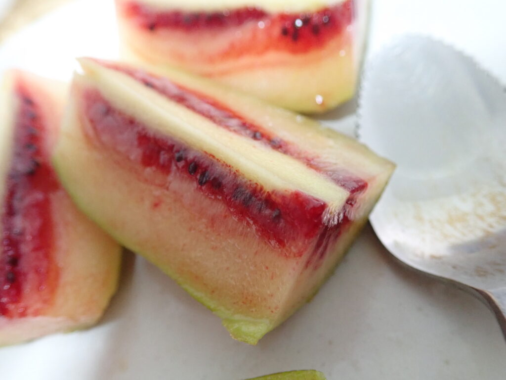 包丁を入れて切り開いてみると、キウイの中心にかけて明るいレッドの配色が見られます。ビビットな感じでとても鮮やかですね。これはおいしそうです。