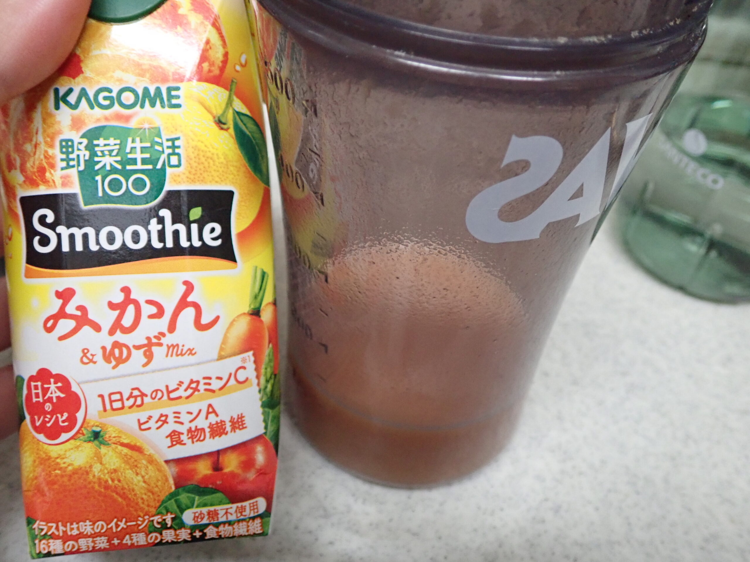 この200mlの内、水を100ml,カゴメのスムージーを100ml入れてそこにプロテインを入れてシェイクします。