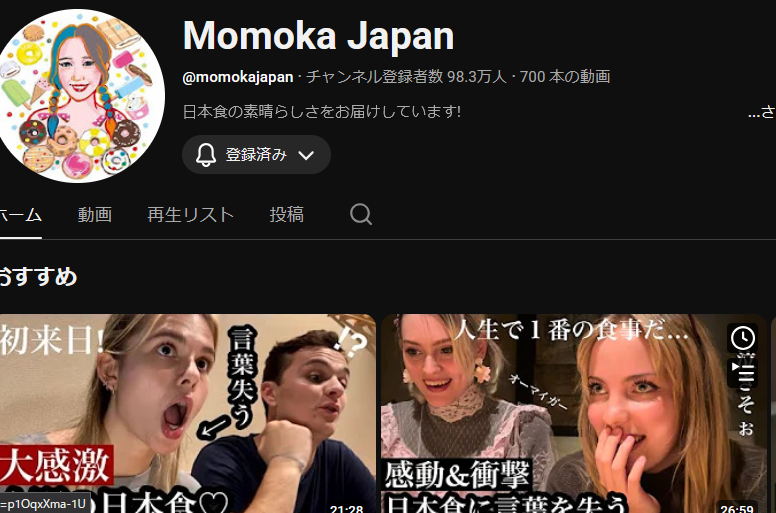 私のおススメはやはり外国人に日本の美味しい食材を食べてもらう日本食冒険記やMomokaチャンネルですね。